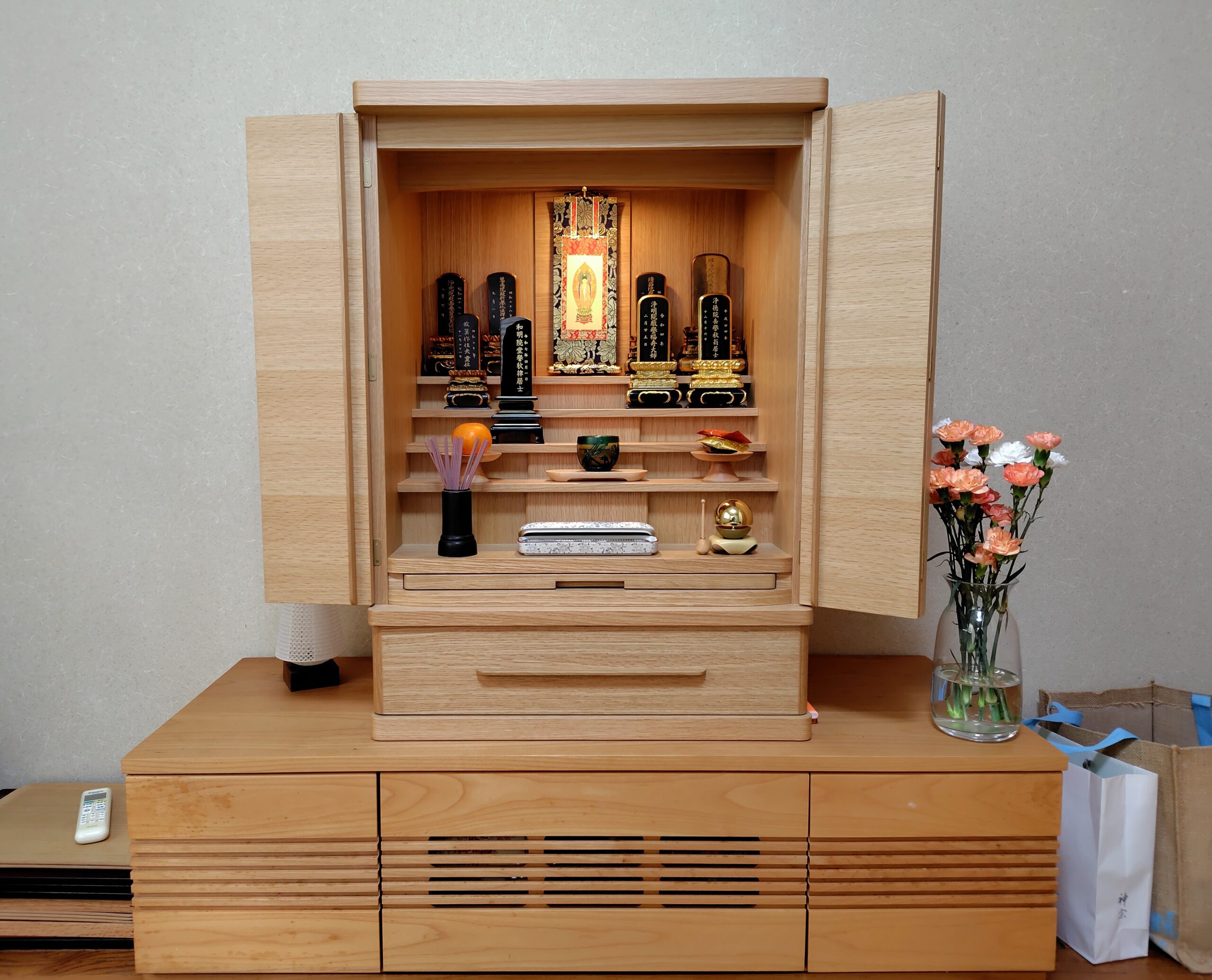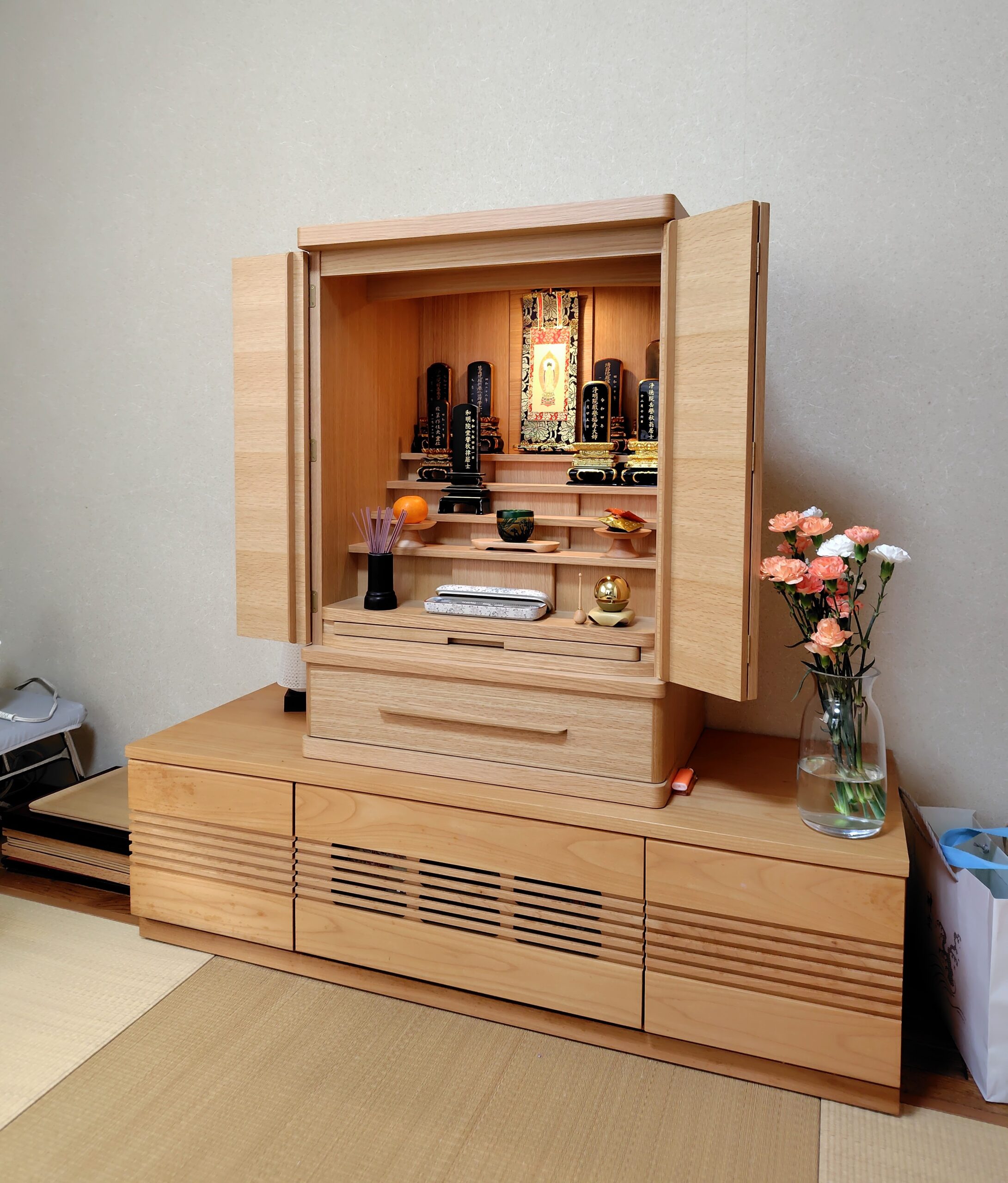 横浜市港北区の川久保様のご自宅に国産モダン型上置き仏壇(リメイク仏壇)をお届けいたしました。