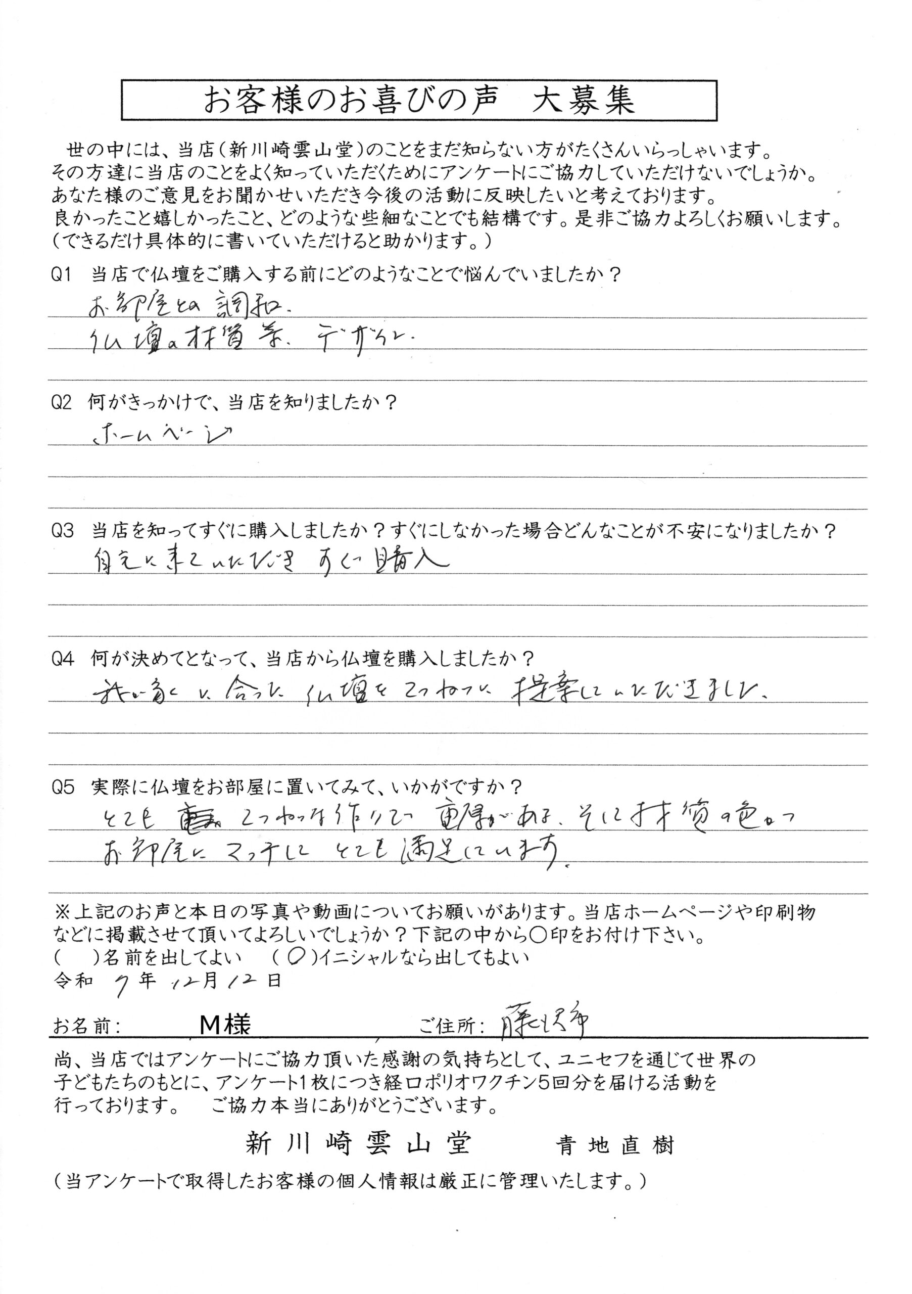 川崎市宮前区のA様のお宅に国産セミオーダー仏壇の納品を行いました。