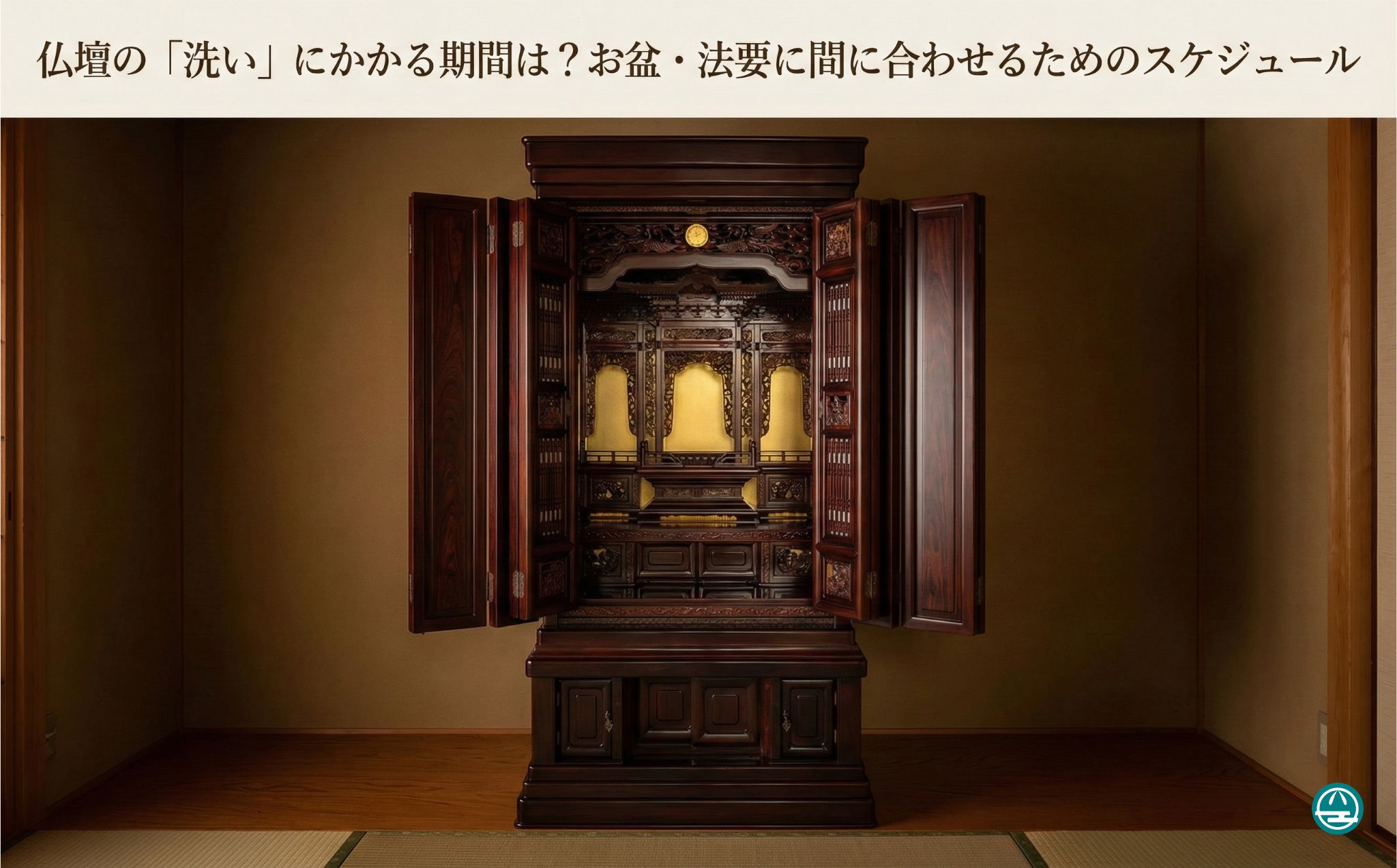 大切な行事をきれいなお仏壇で迎えたいと考えたとき、多くの方が検討されるのが仏壇の「洗い(修繕)」です。しかし、いざ依頼しようとすると、「どのくらいの期間がかかるのか」「法要の日に間に合うのか」といった不安や疑問がつきまといます。