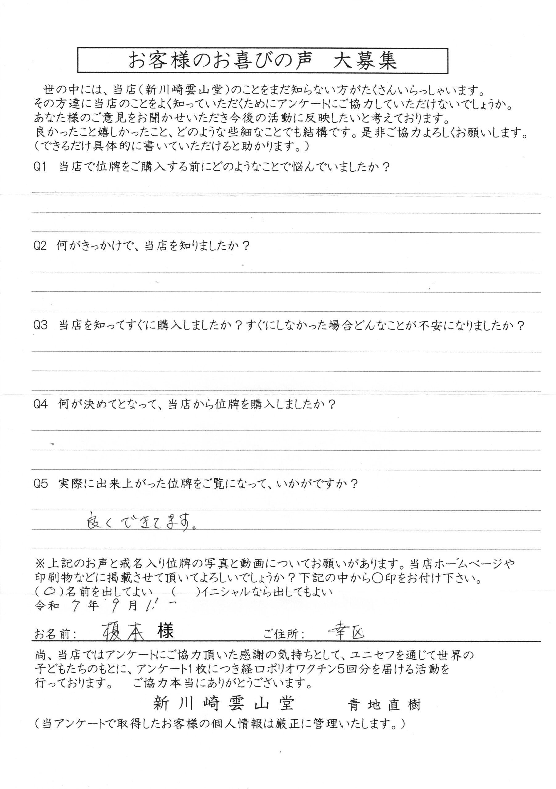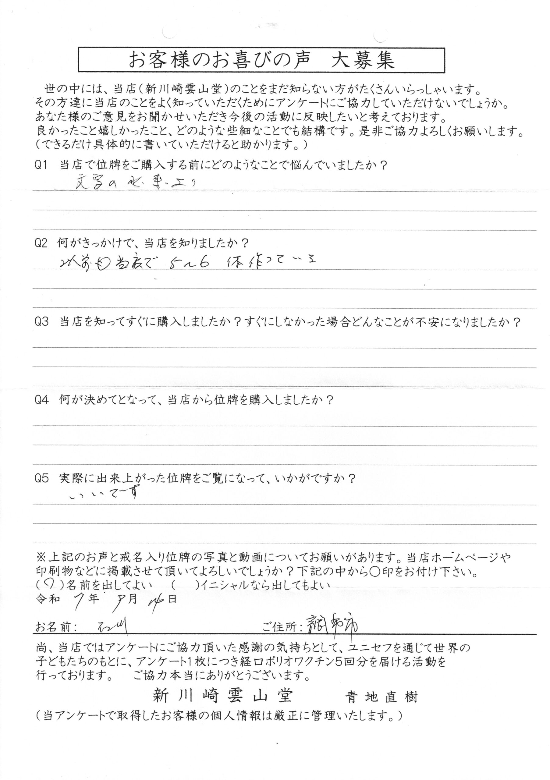 川崎市幸区のお客様からご依頼されたお位牌の文字入れが完成致しました。