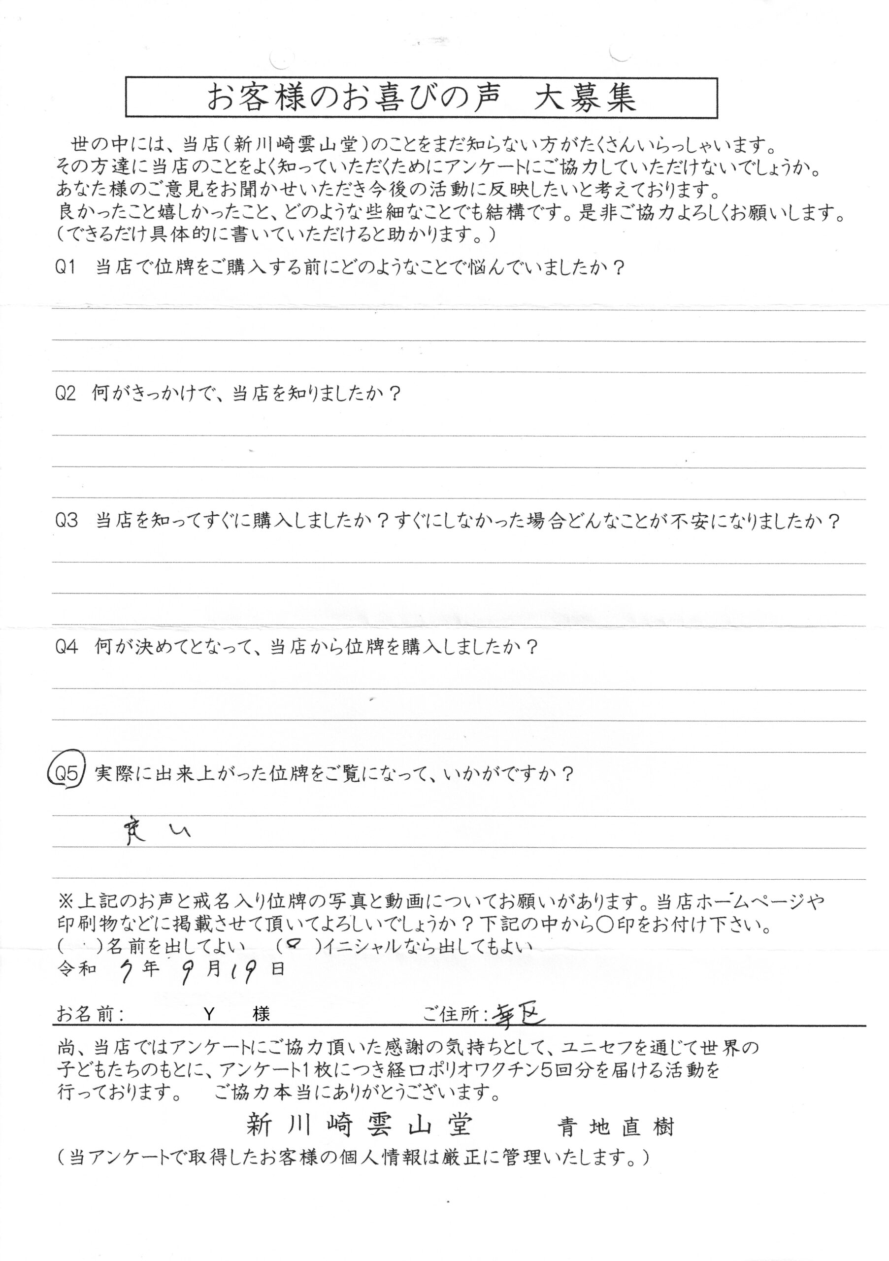 横浜市磯子区のお客様からご依頼されたお位牌の文字入れが完了致しました。