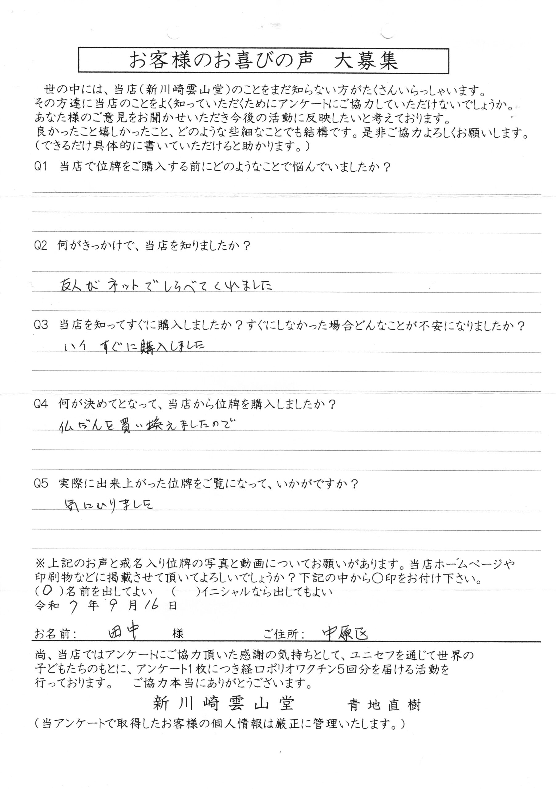 川崎市中原区のお客様からご依頼されたお位牌の文字入れが完成致しました。