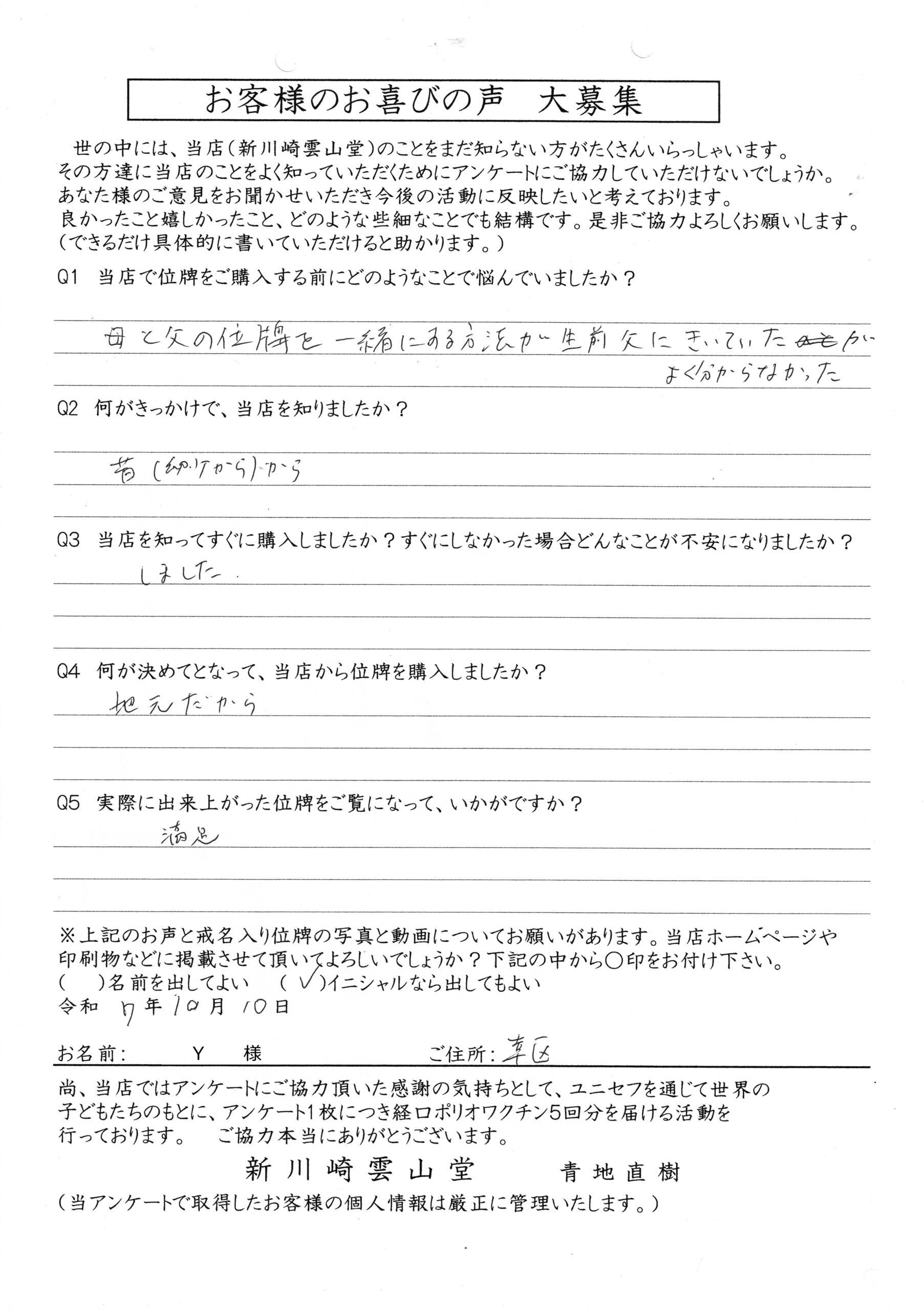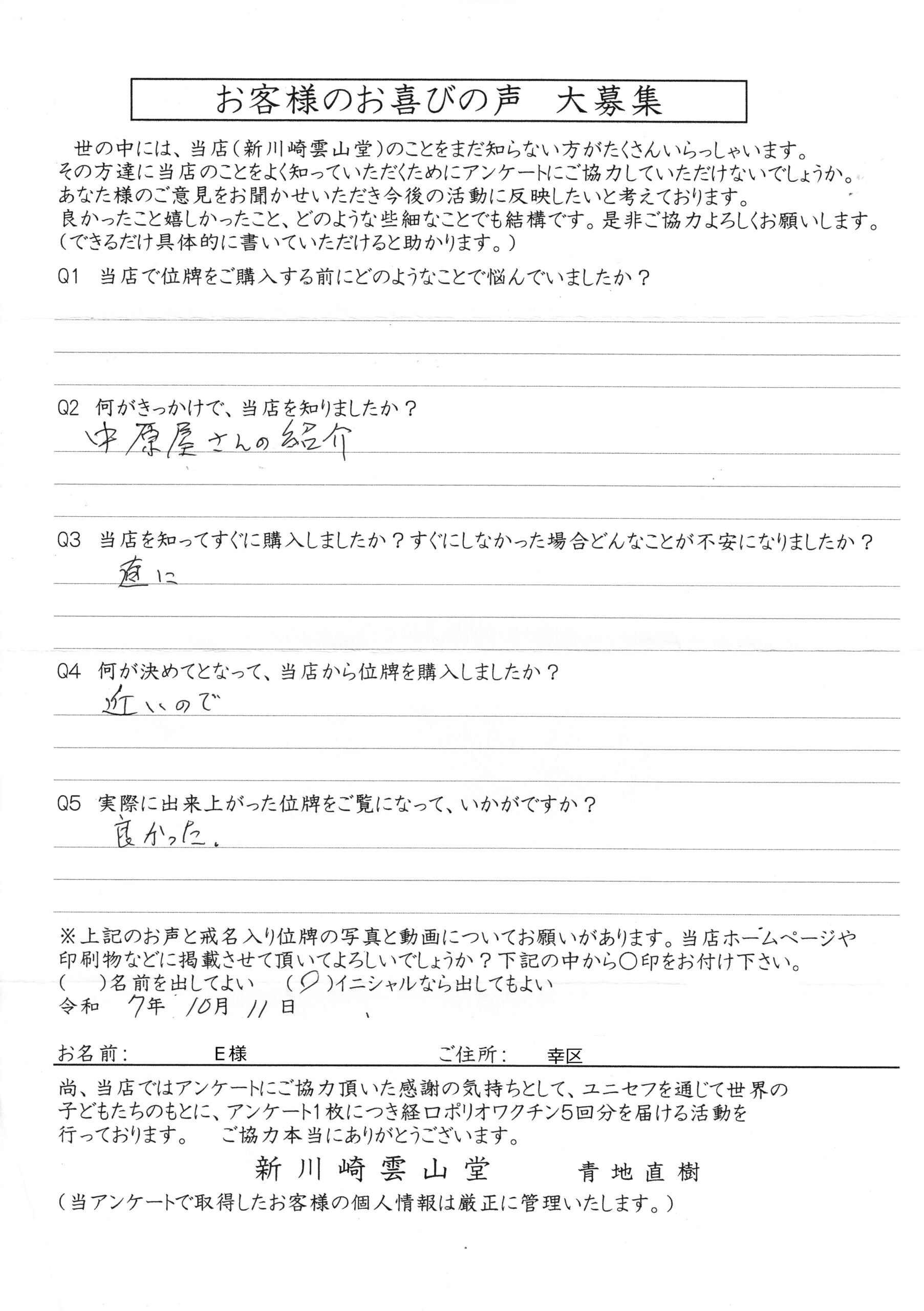 川崎 オリジナル仏壇店【新川崎雲山堂】TOP > 位牌納品事例
