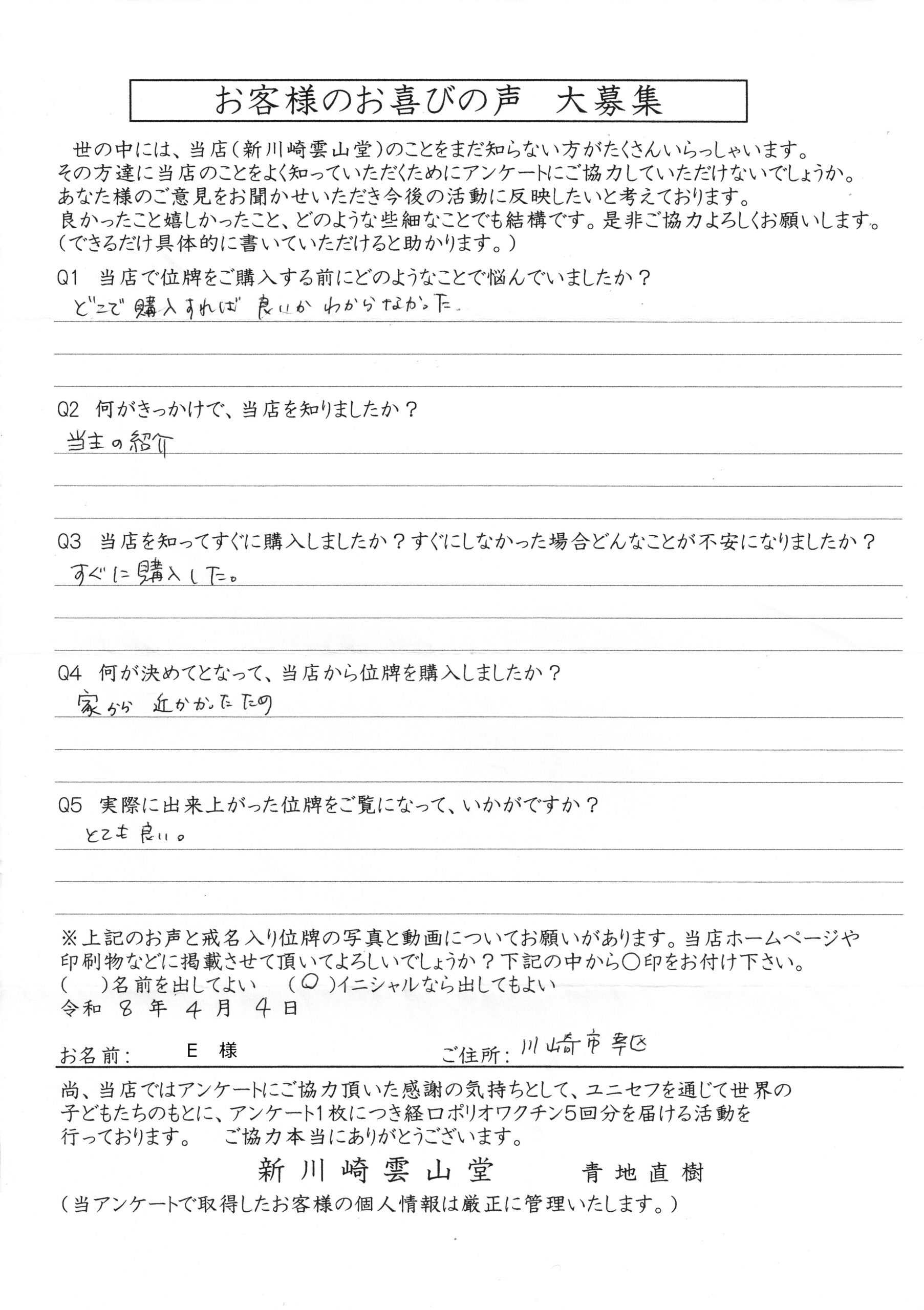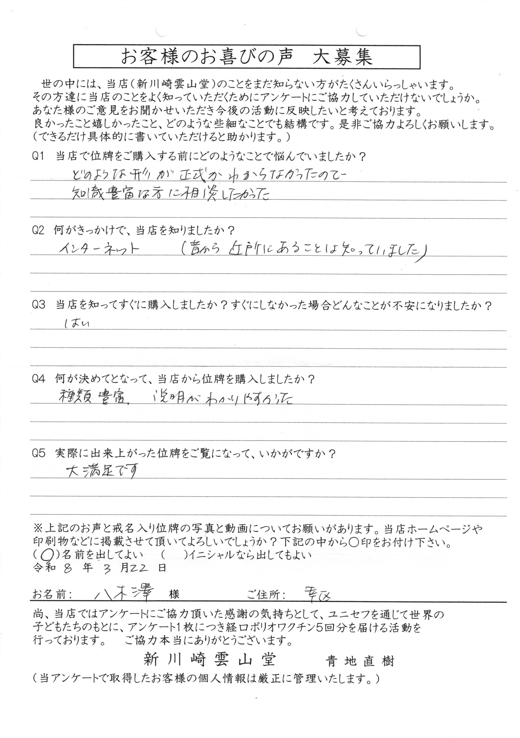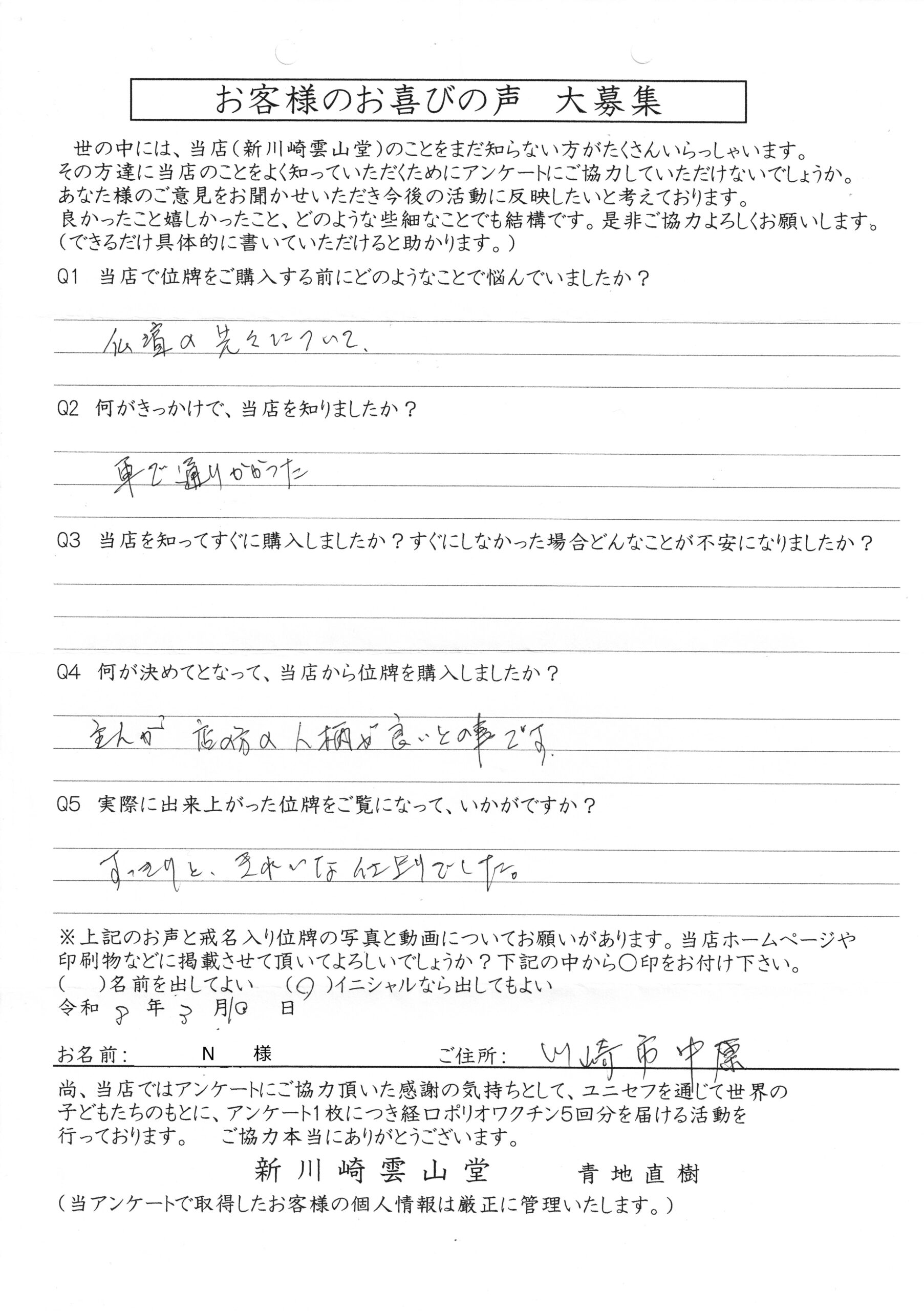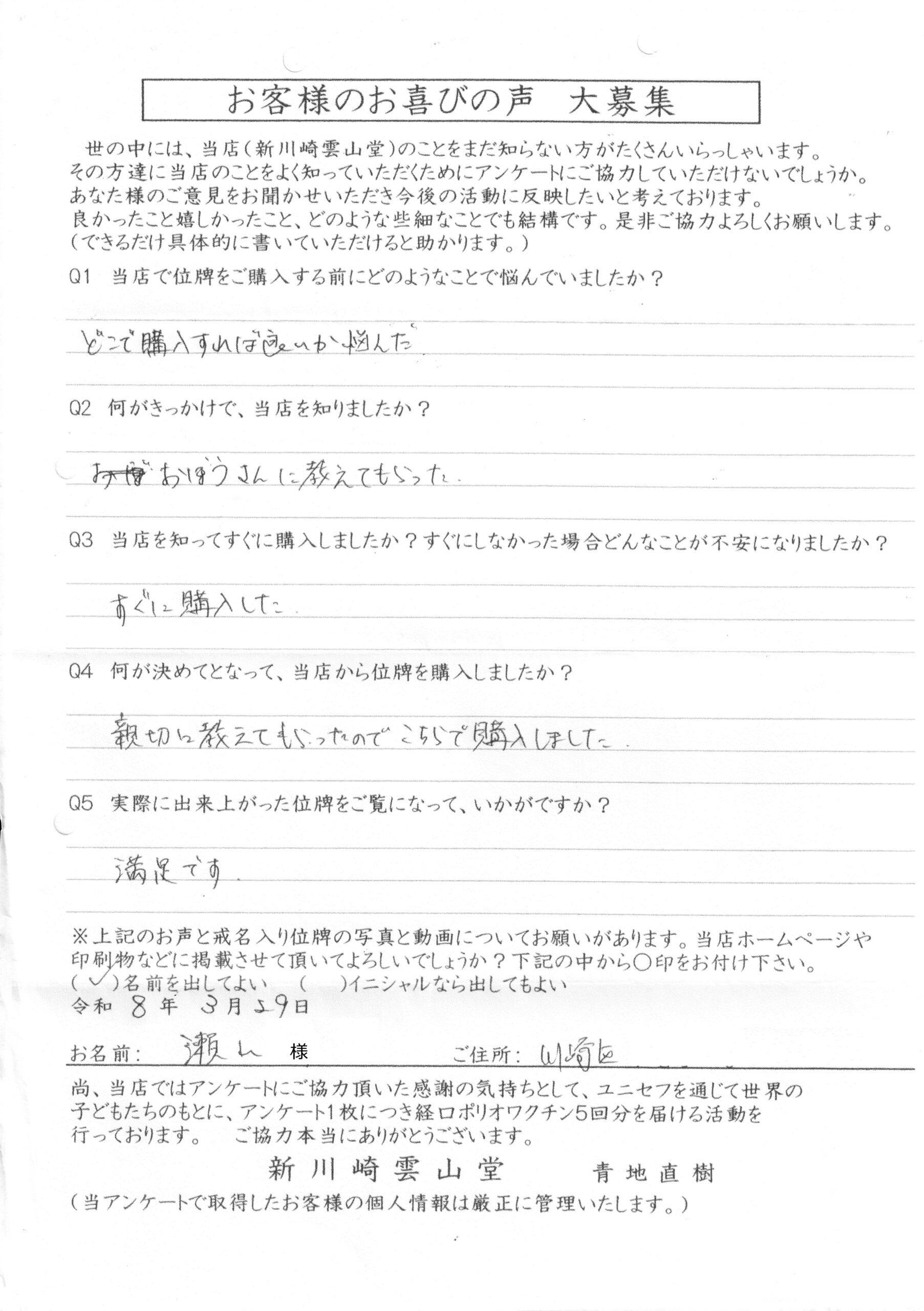 川崎 オリジナル仏壇店【新川崎雲山堂】TOP > 位牌納品事例