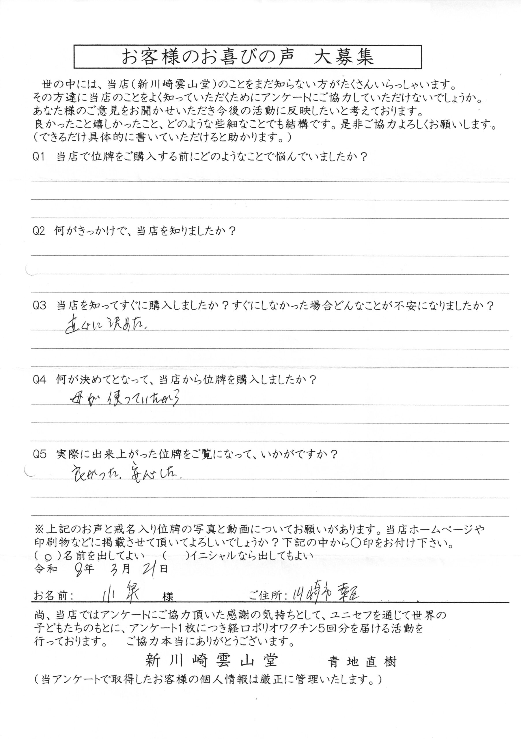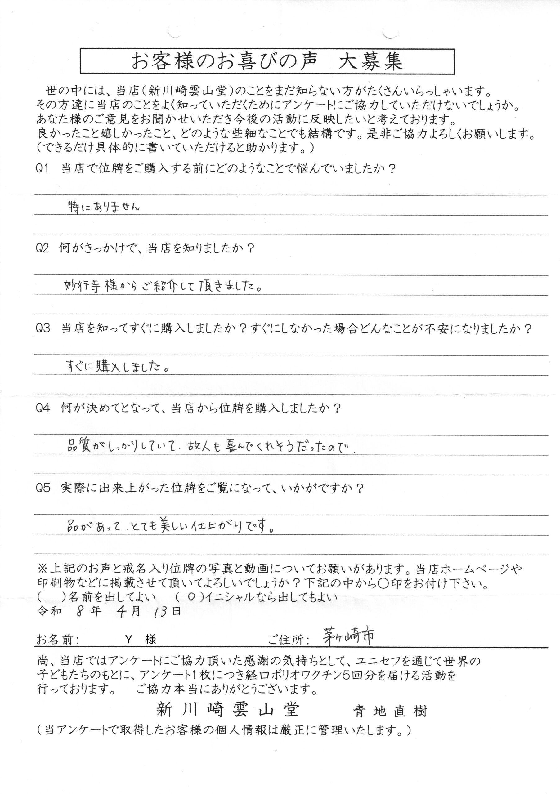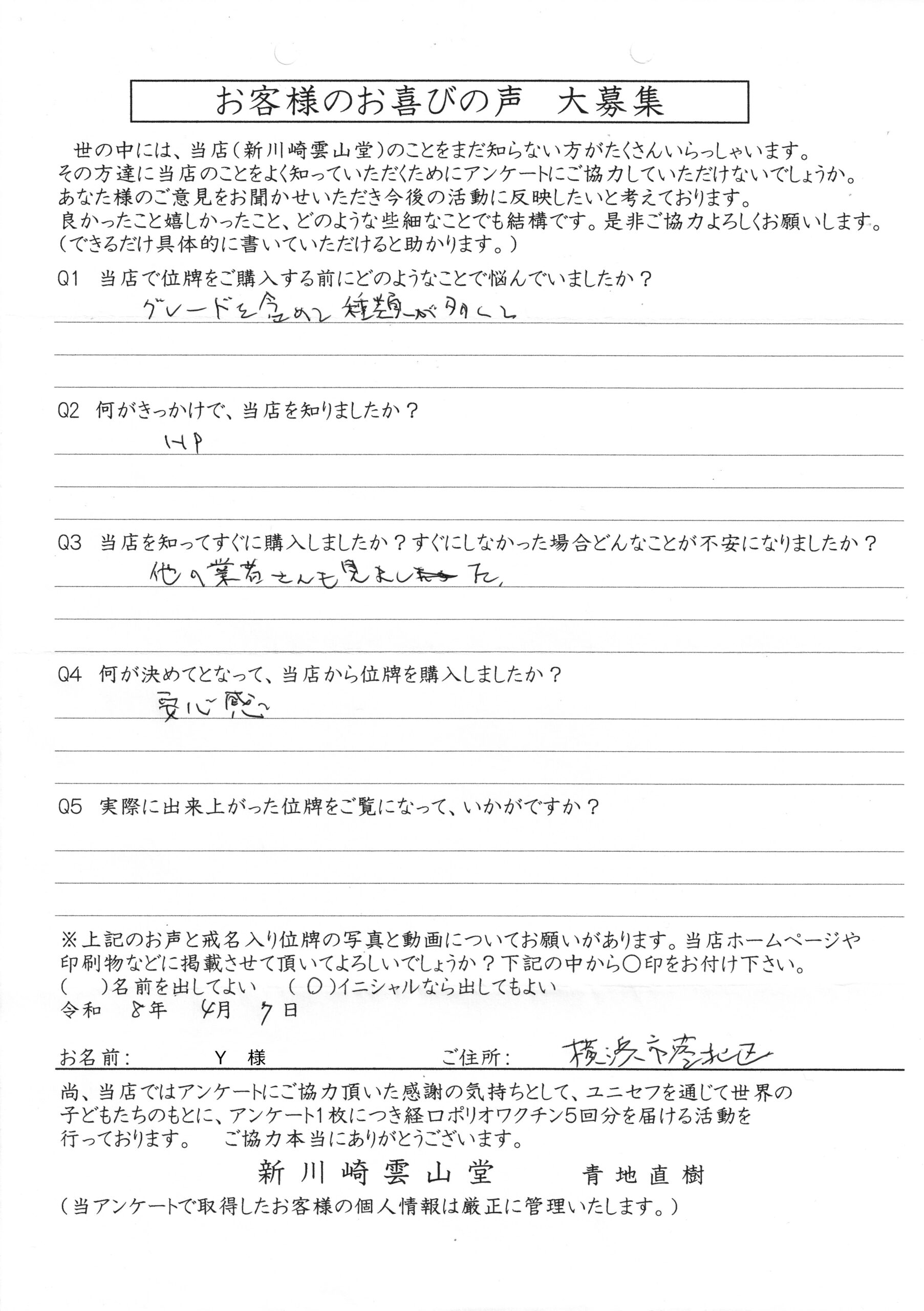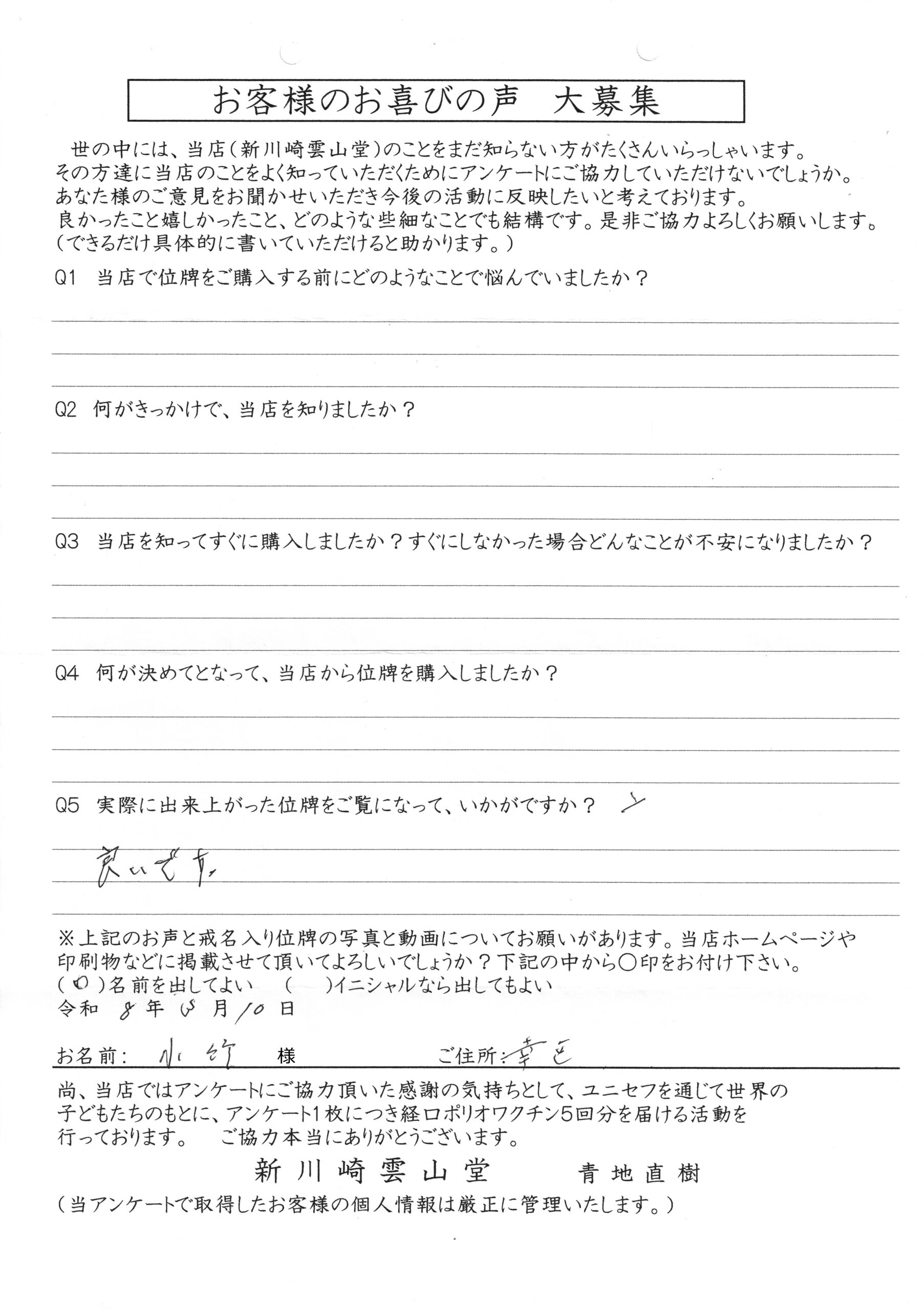 川崎 オリジナル仏壇店【新川崎雲山堂】TOP > 位牌納品事例
