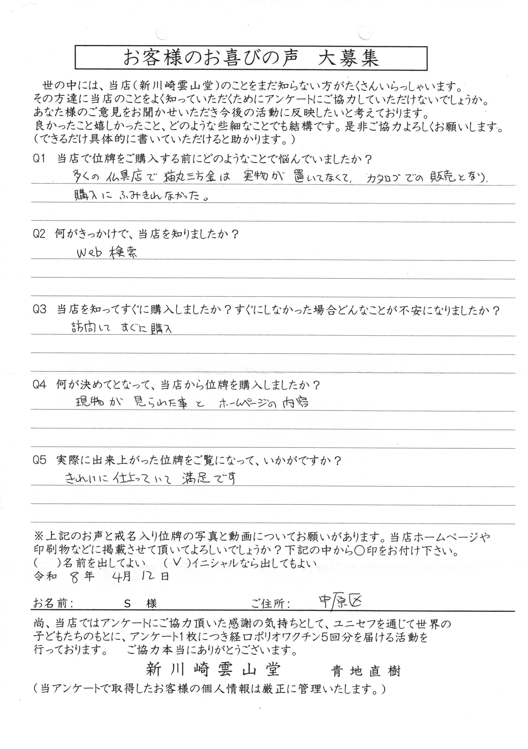 川崎市中原区 S様 猫丸三方金 4寸