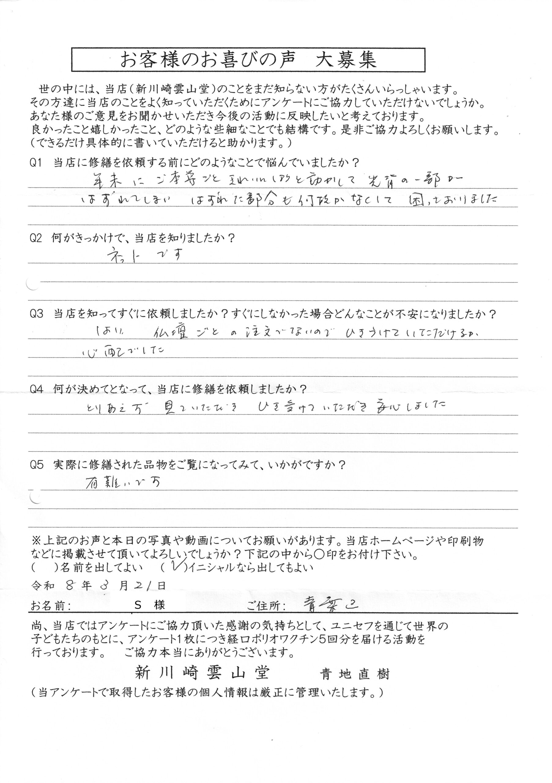 川崎 オリジナル仏壇店【新川崎雲山堂】TOP > 仏壇他修理事例