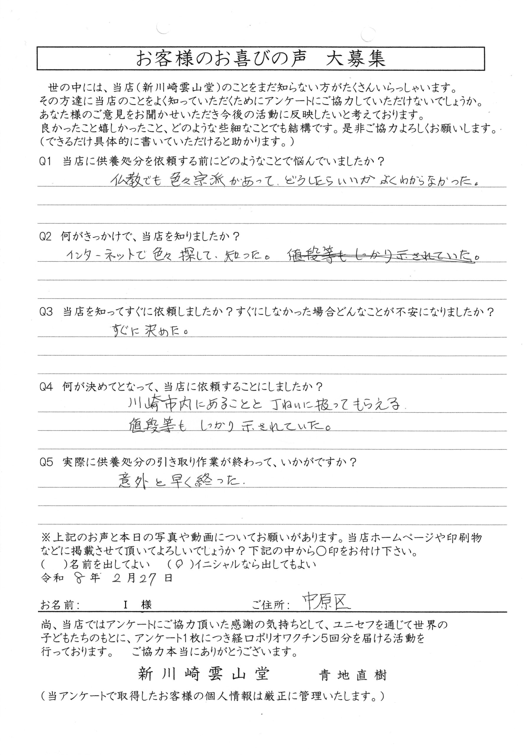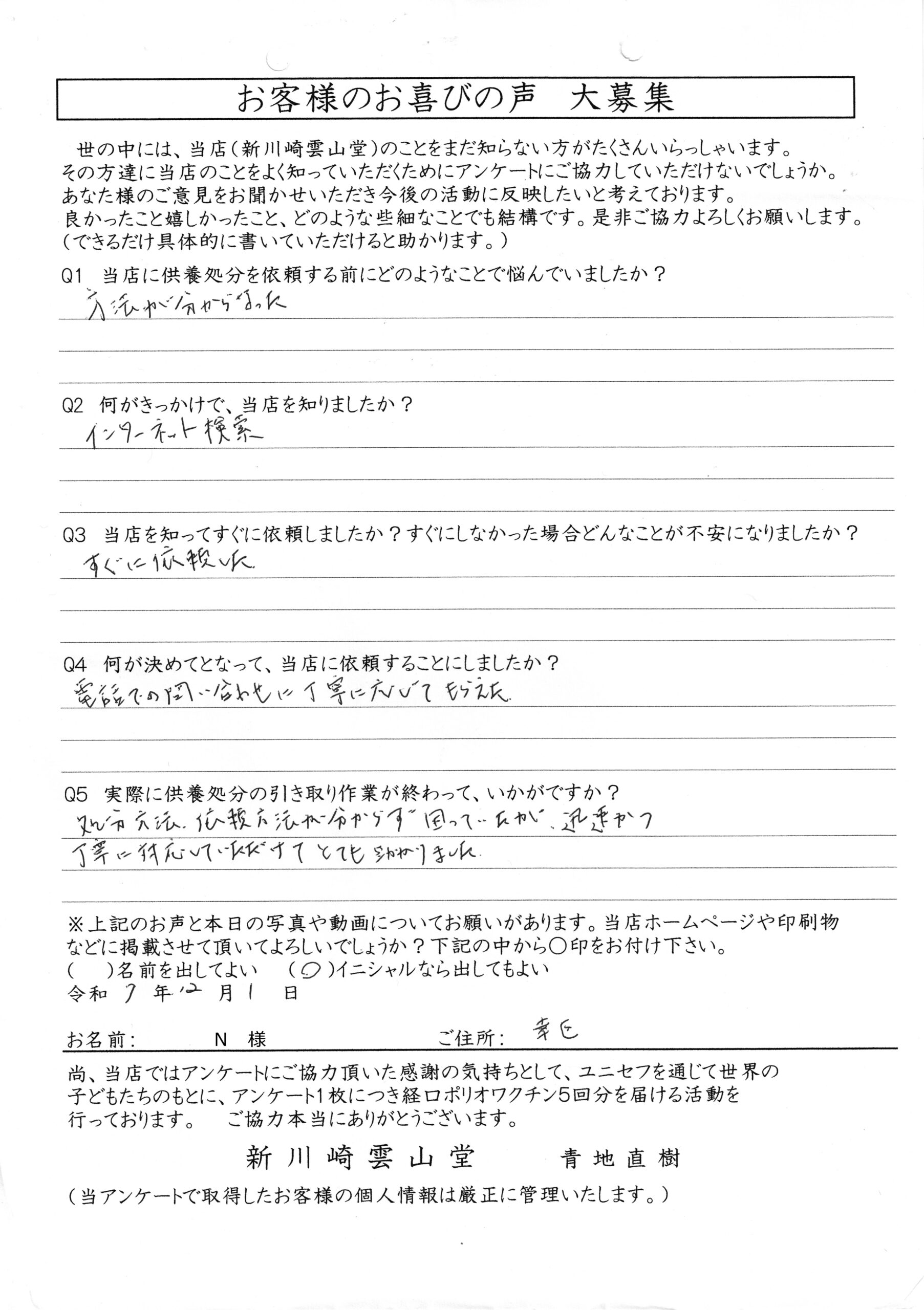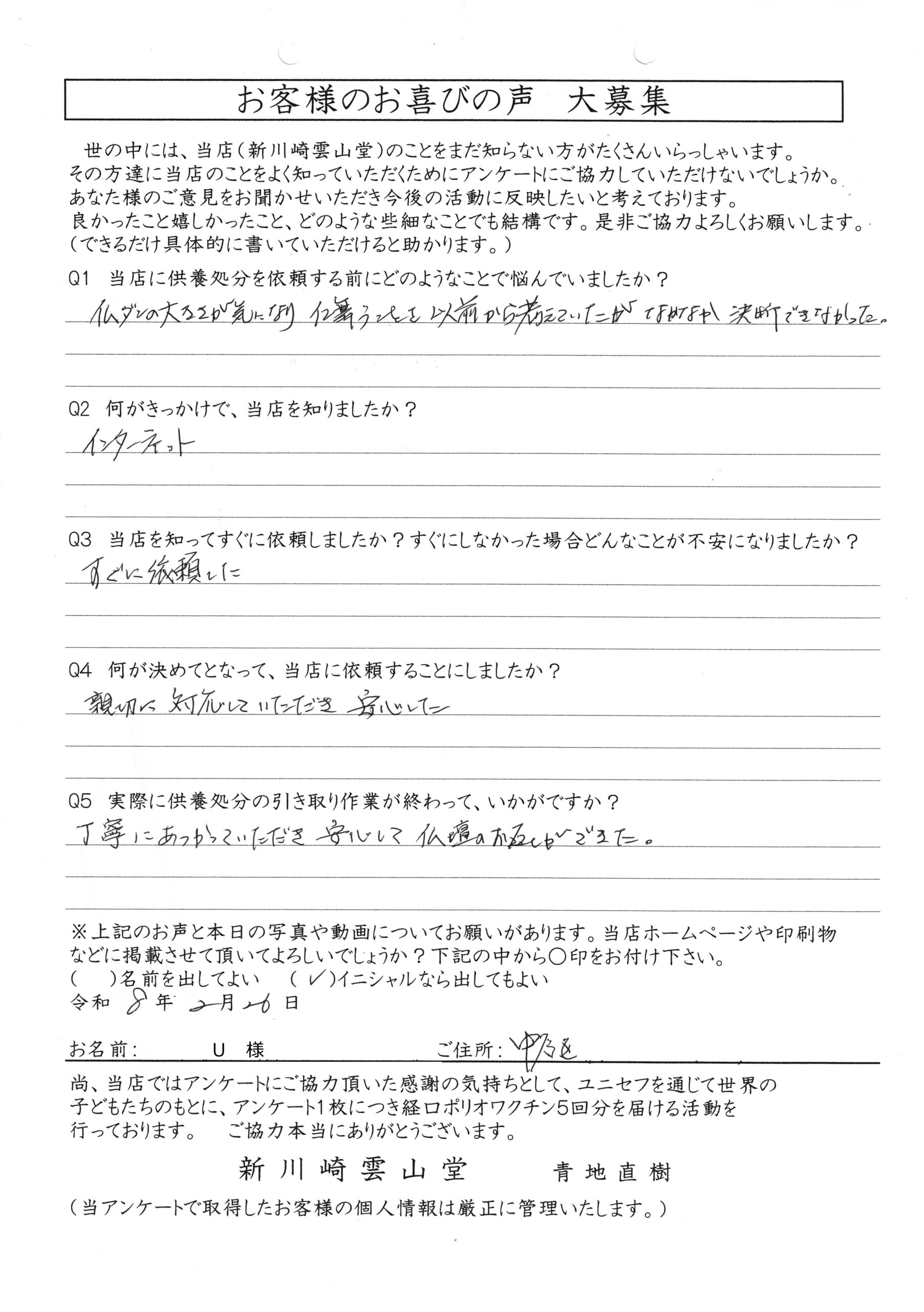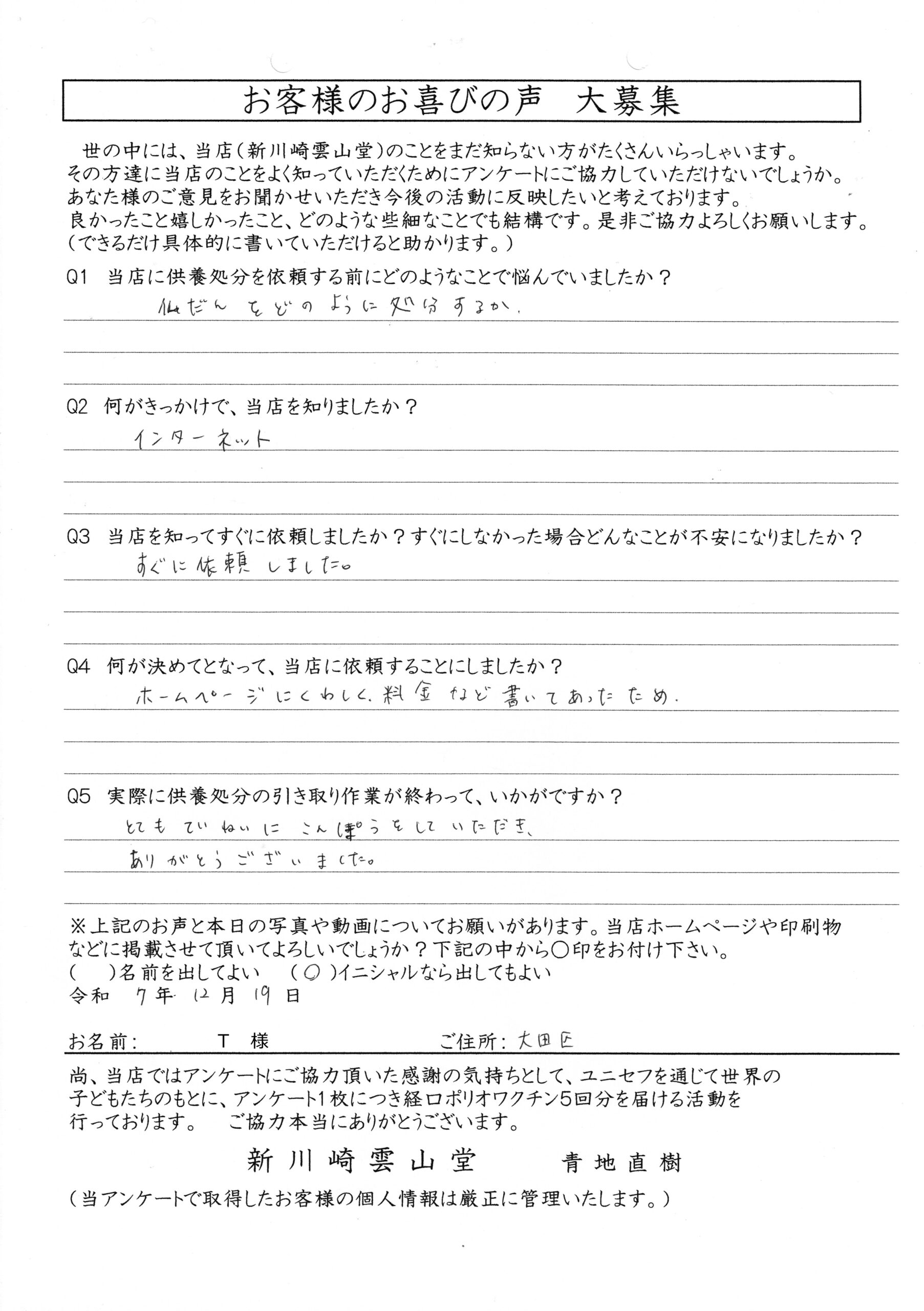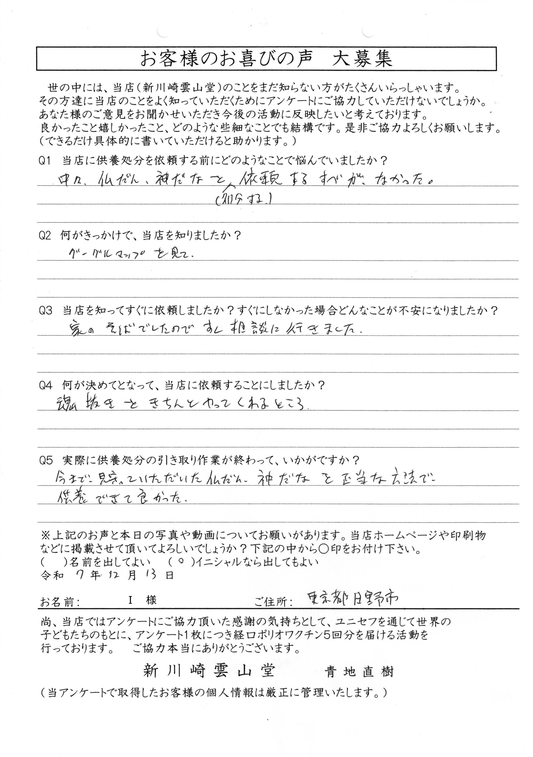川崎 オリジナル仏壇店【新川崎雲山堂】TOP > 仏壇の供養・処分 お客様の声