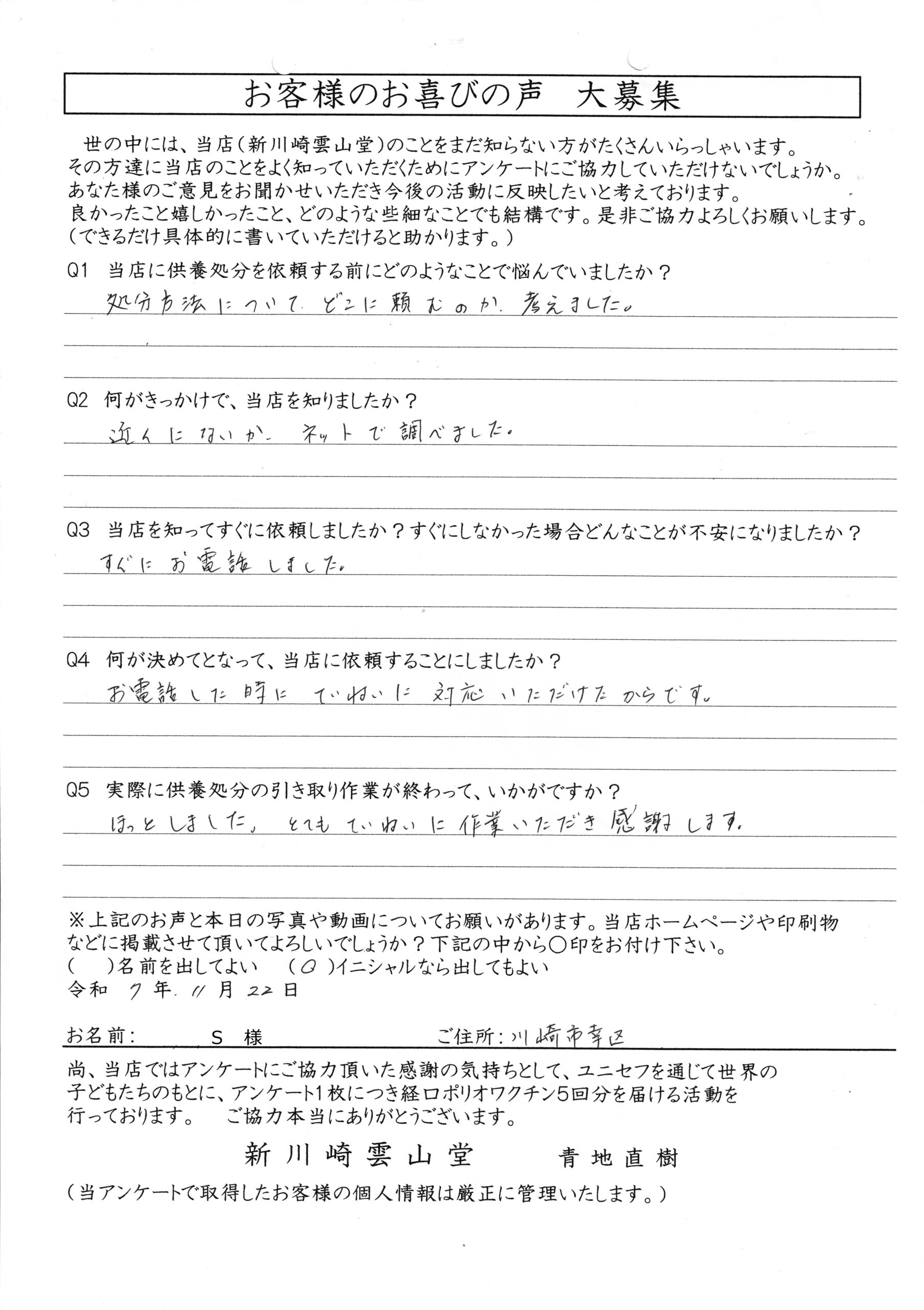 川崎 オリジナル仏壇店【新川崎雲山堂】TOP > 仏壇の供養・処分 お客様の声