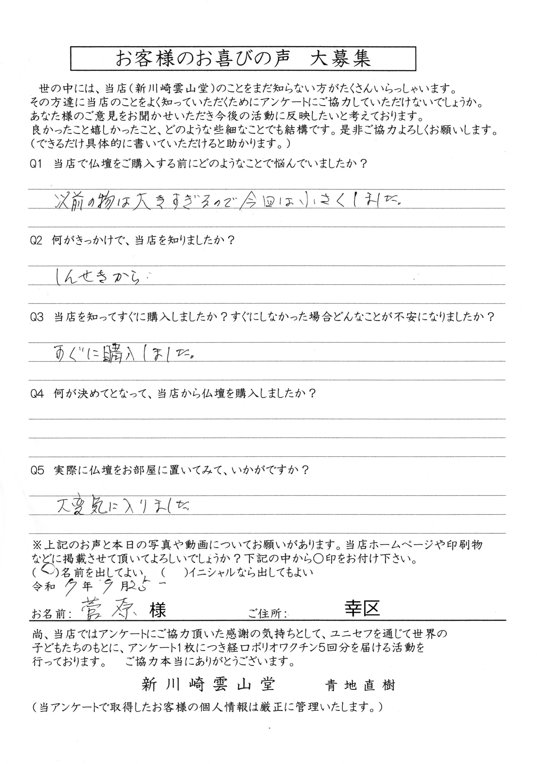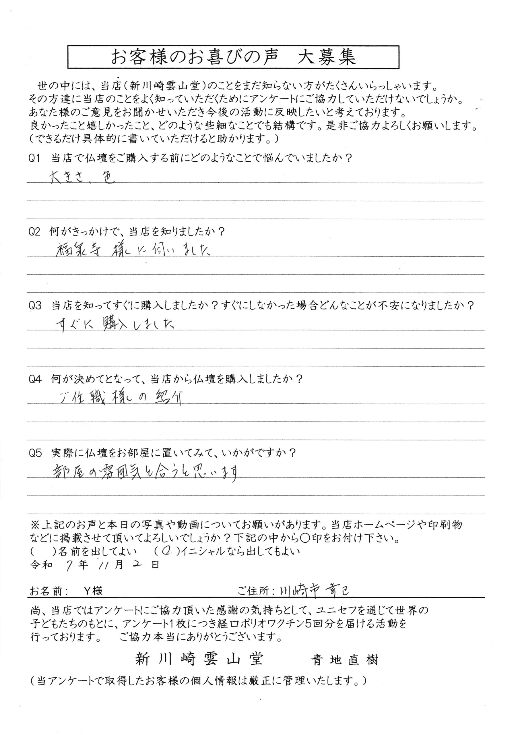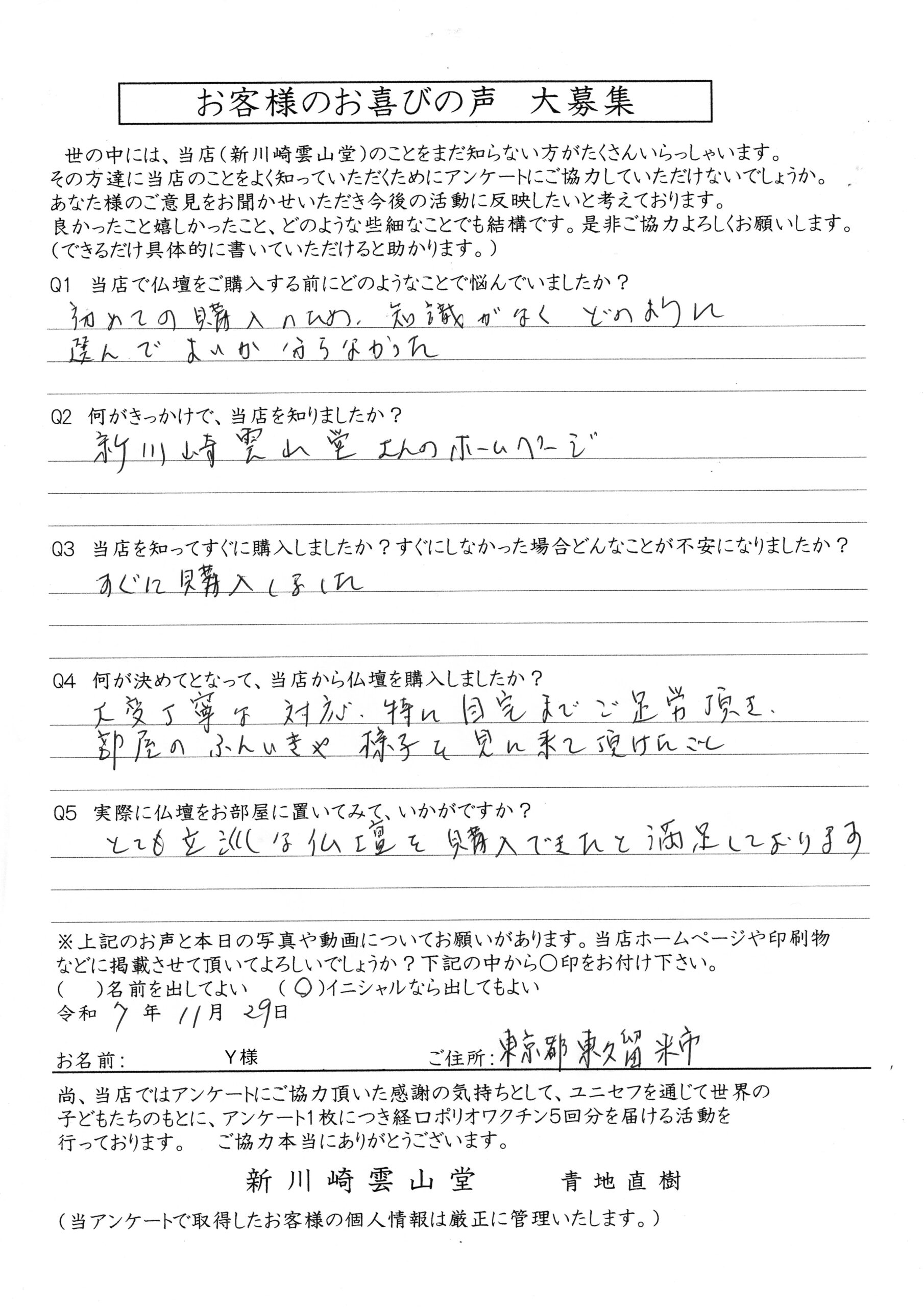 川崎 オリジナル仏壇店【新川崎雲山堂】TOP > 仏壇納入事例(お客様の声)