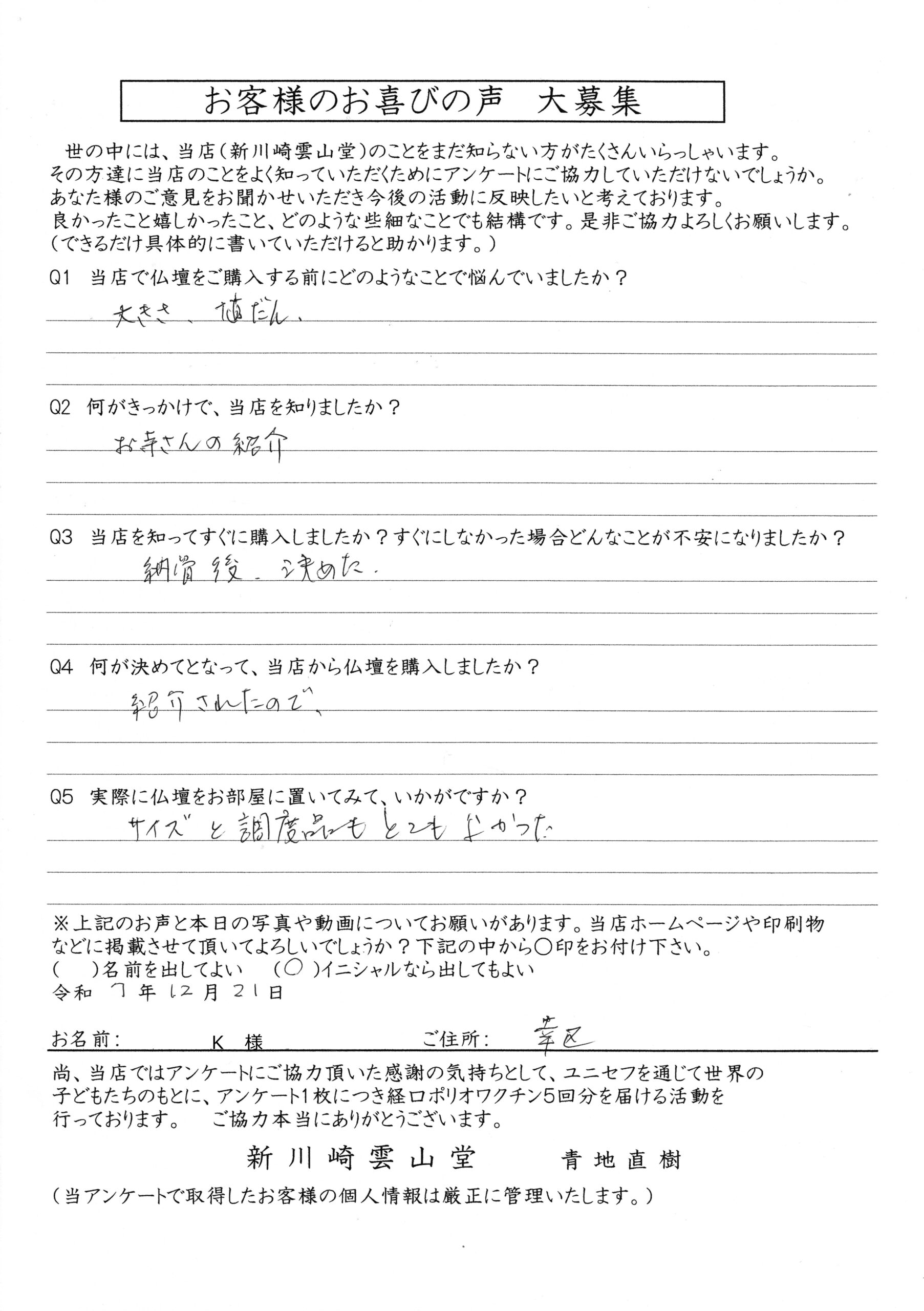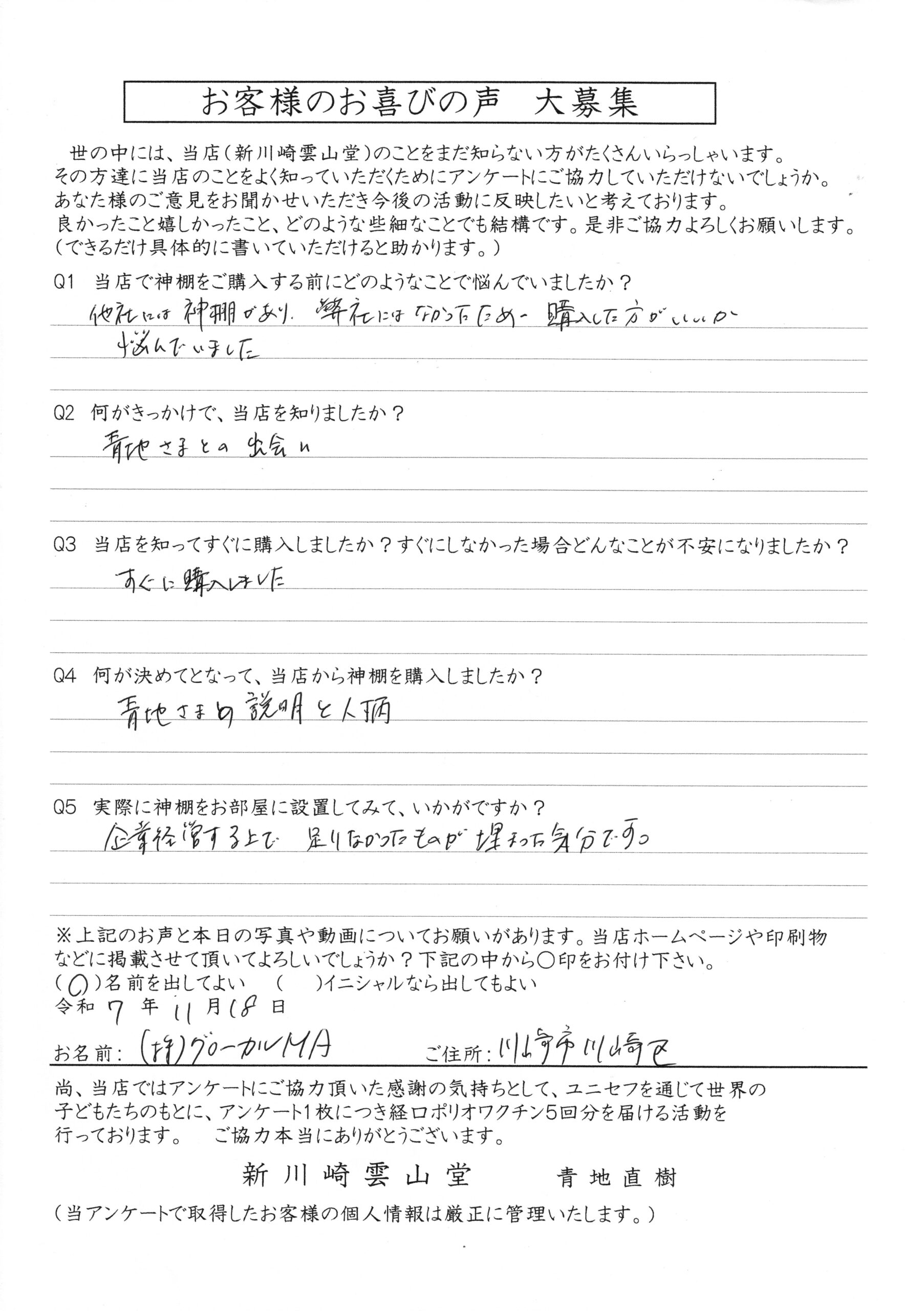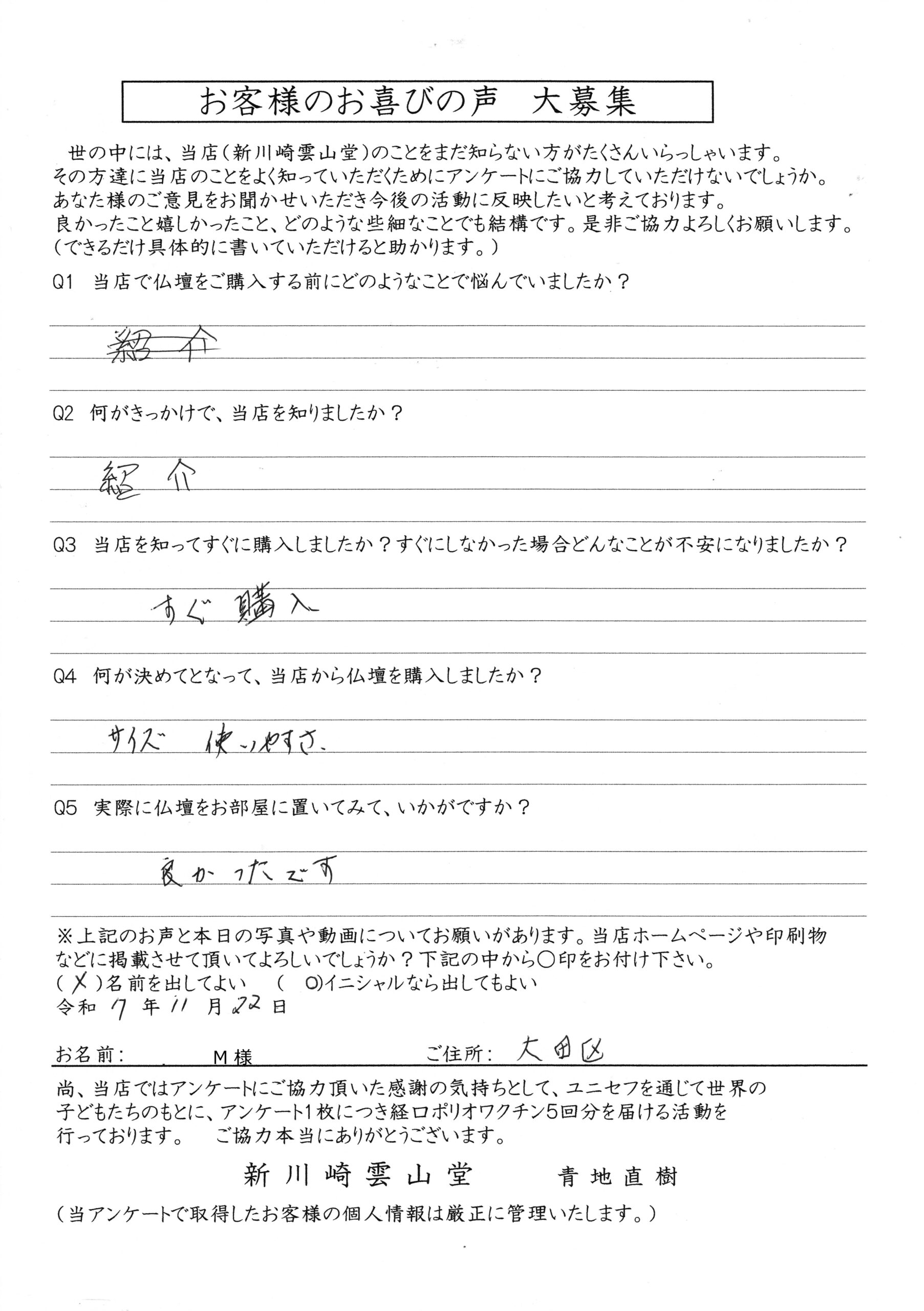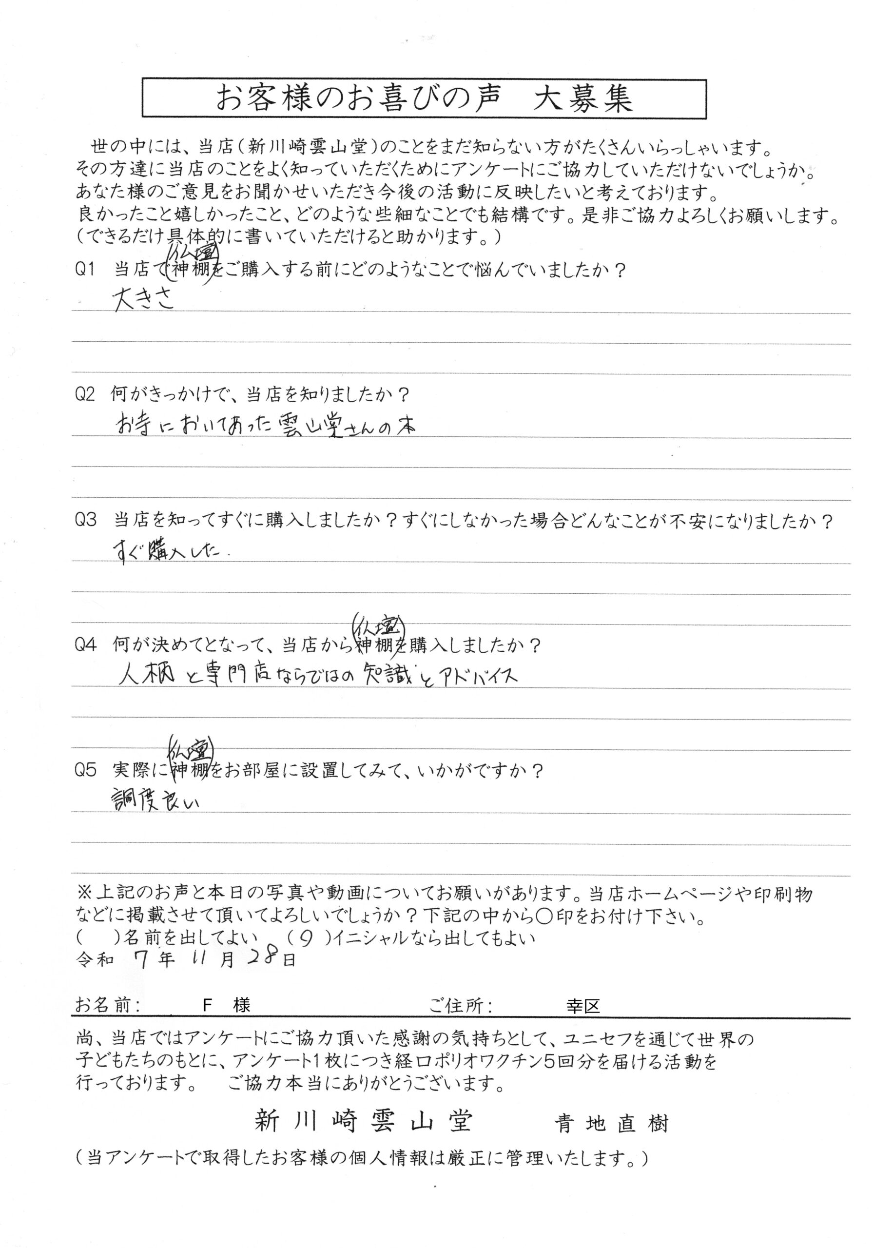 川崎 オリジナル仏壇店【新川崎雲山堂】TOP > 仏壇納入事例(お客様の声)