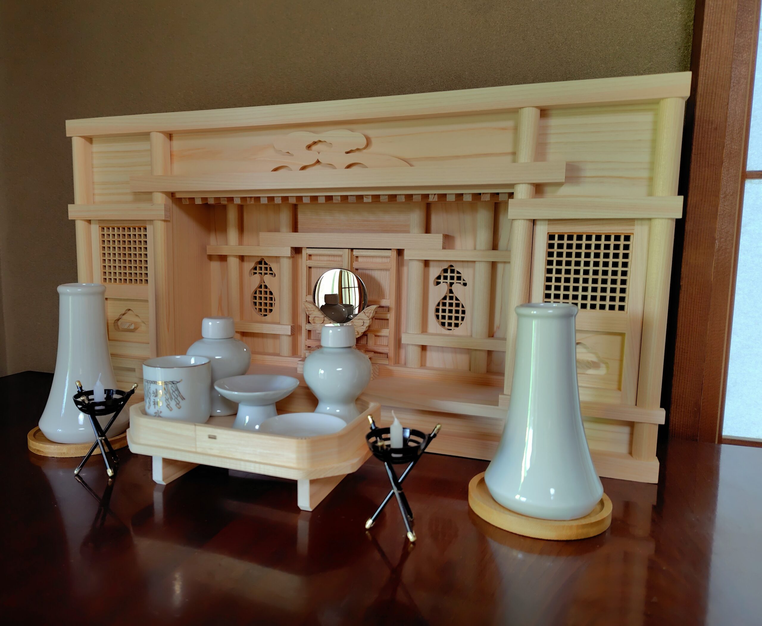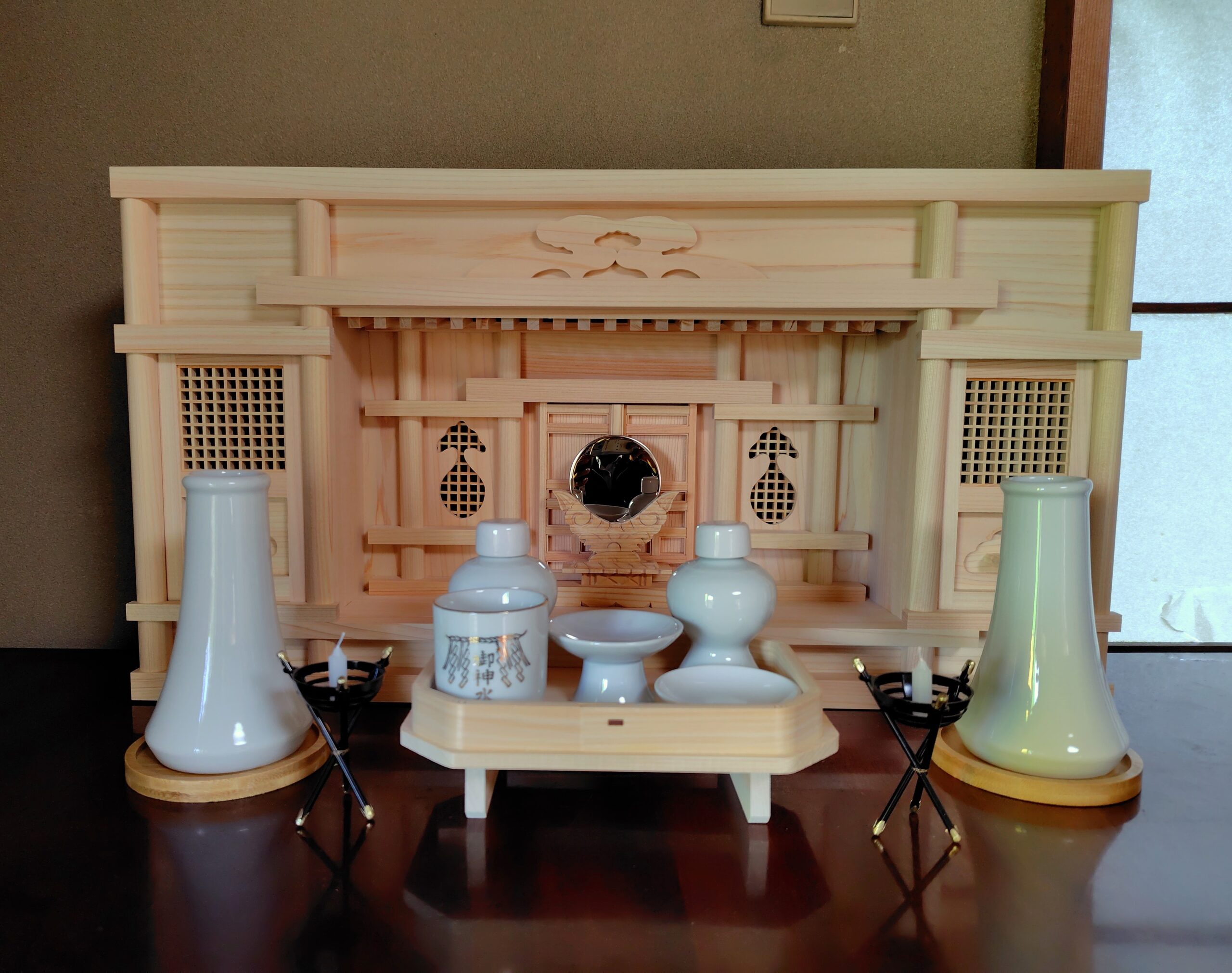 川崎市幸区のお客様のご自宅に国産モダン型上置き仏壇と神棚をお届けいたしました。
